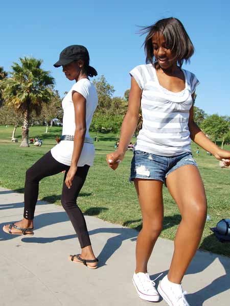 Taylor and Ashley demonstrate the Reject at the L.A. Youth dance party shoot at Pan Pacific Park.