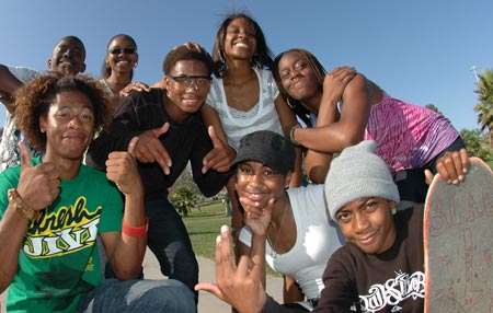 From left: CJ Hughes, 17, Rolling Hills Prep (San Pedro); Taylor’s brother Omari Moore; Morgan Phillips, 15, Community Harvest Charter School; Blair Hughes, 15, Westchester HS; Taylor Moore, 15, Westchester HS; Ashley Williams, 13; Rwanda Carter, 16, Westchester HS; and Donnie Hawkins, 12, Wilder’s Prep Academy (Inglewood).