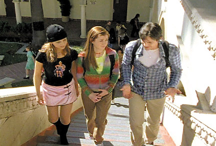 The Hollywood version—Buffy, Willow and Xander walk up the stairs of Sunnydale High.